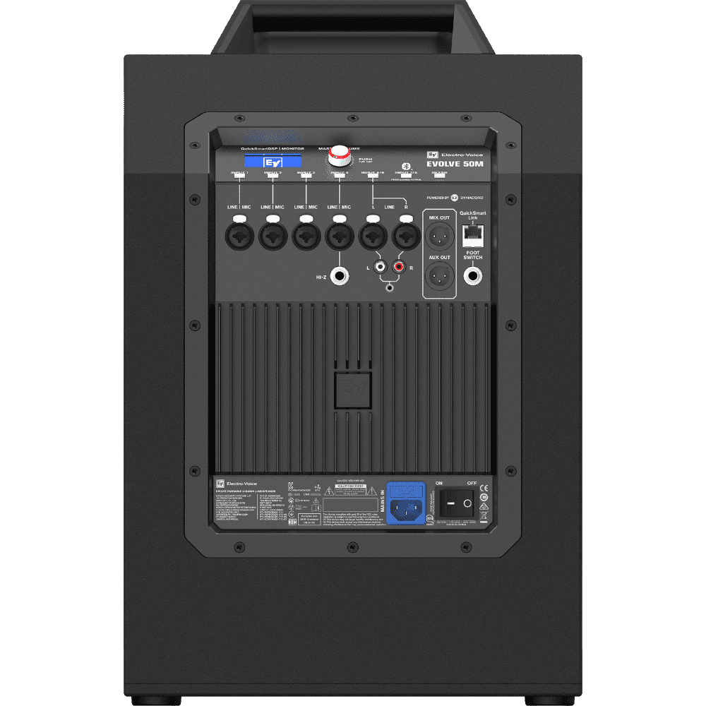 Electro Voice EVOLVE 50M Portable Powered Column System– Portable Powered Column System processing engine allows for easy setup via four presets (Music, Live, Speech, and Club), three-band EQ, five user-programmable presets (Store and Recall settings), output delay, phantom power (+15V), visual monitoring of limiter status, input level control and meters, and master volume control to ensure optimal gain structure.