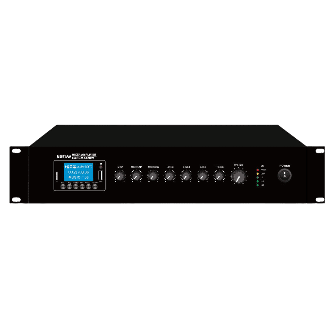 The EONAV EASCMA240W is a versatile 240W mixer amplifier that delivers clear, powerful sound with multiple playback options — including USB, Bluetooth, and FM radio. Its intuitive controls and robust performance make it a great choice for halls, classrooms, shops, and medium-to-large PA systems