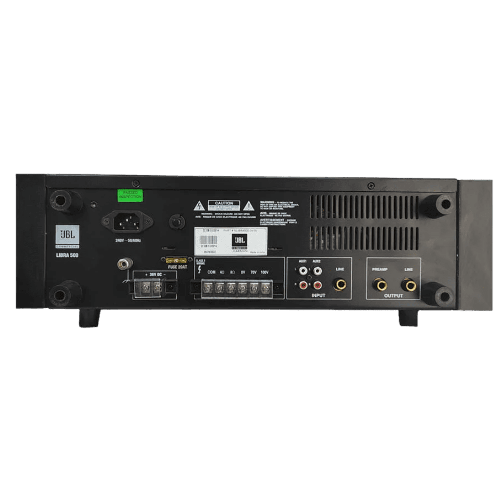 JBL Libra 500 Mixer Amplifier With AC & DC dual power support, the amplifier continues operating even during power failures, ensuring uninterrupted announcements and emergency communication. Overload and low-voltage protection enhance system reliability, making the Libra 500 a trusted choice for continuous commercial operation.