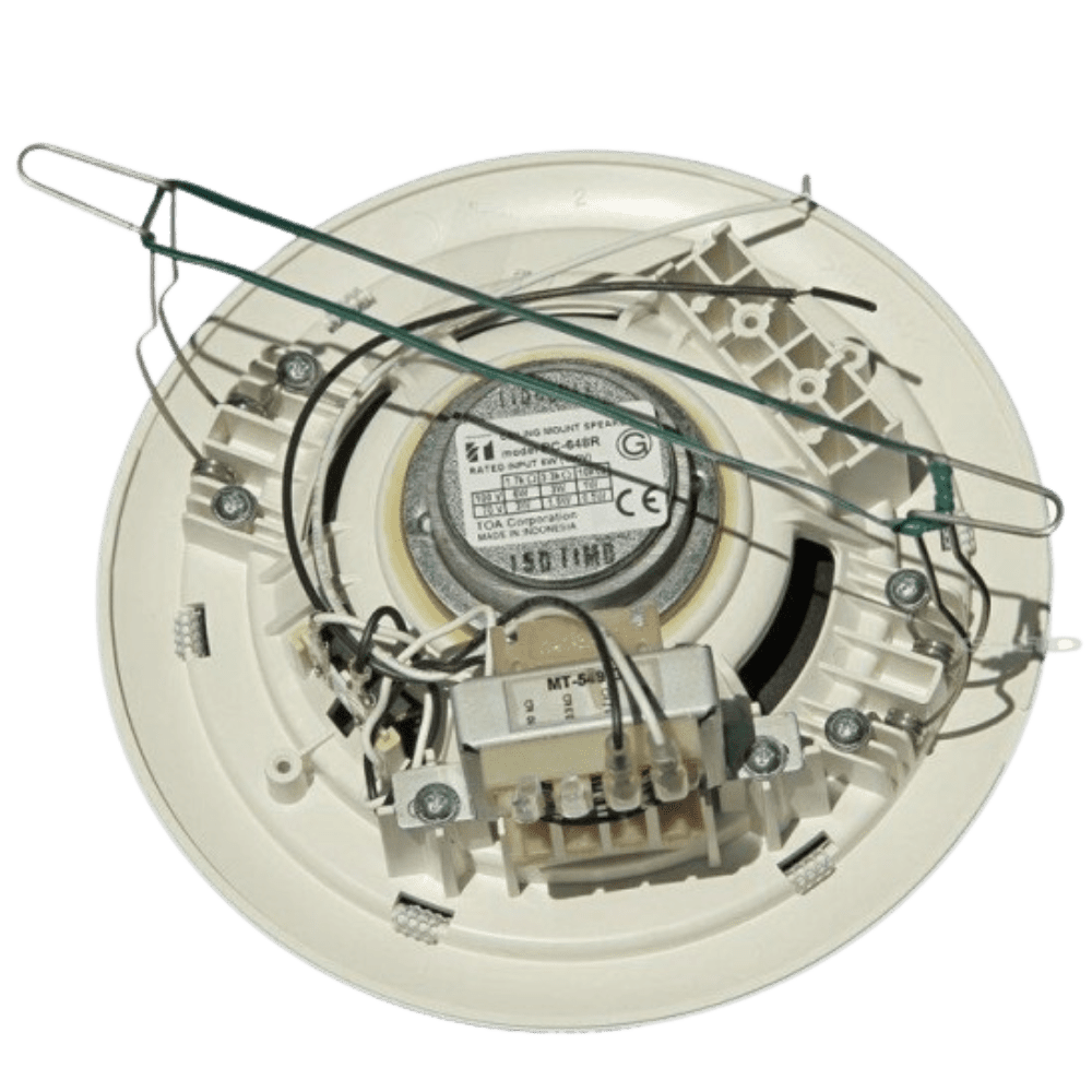 TOA PC-648R Ceiling Speaker With a built-in transformer tap, the TOA PC-648R Ceiling Speaker – Powerful Clear Audio allows adjustable input impedance for flexible PA system integration. Its 12 cm (5″) cone speaker ensures clear vocal projection and reliable performance in offices, retail shops, hospitals, and schools.